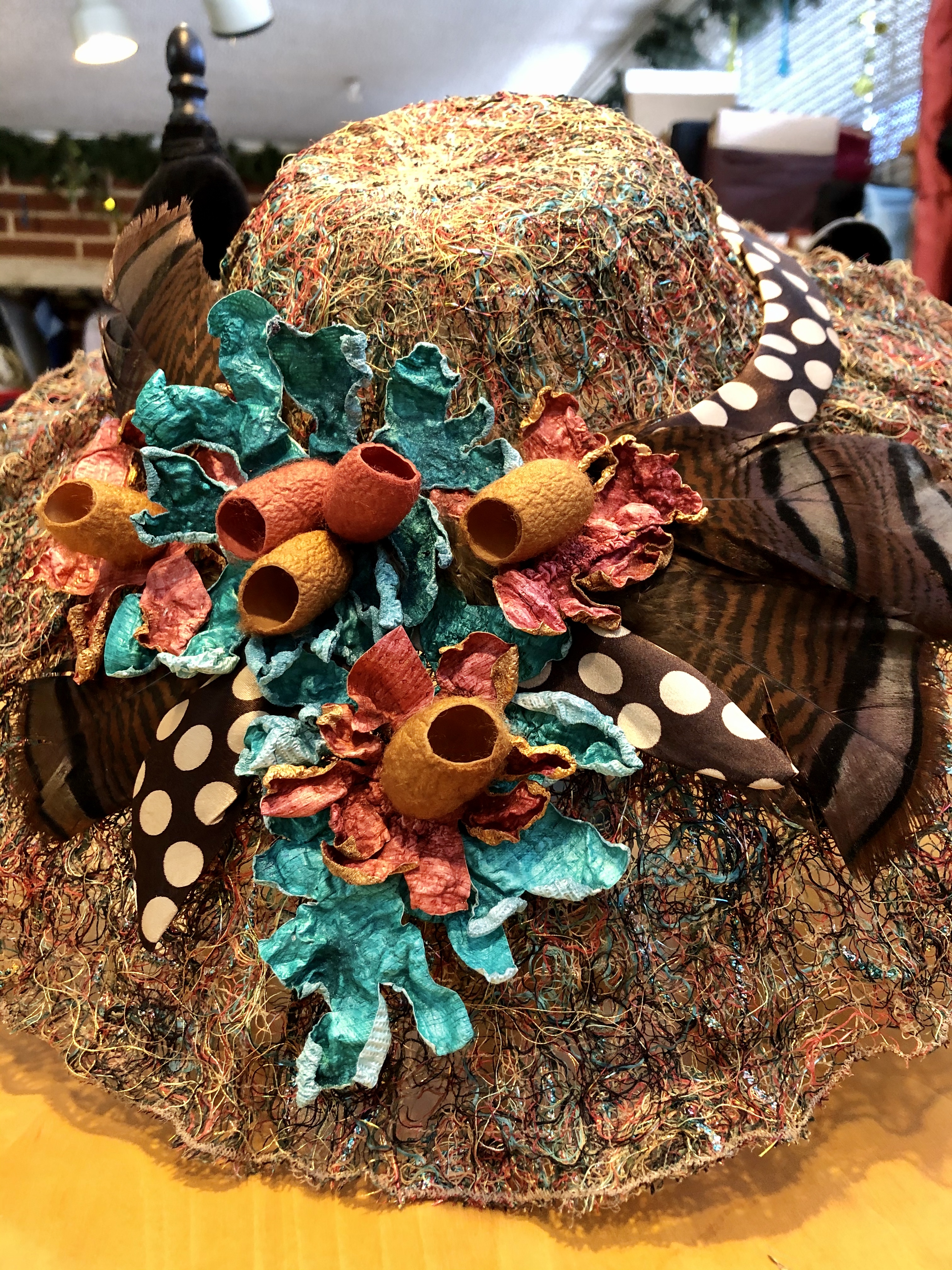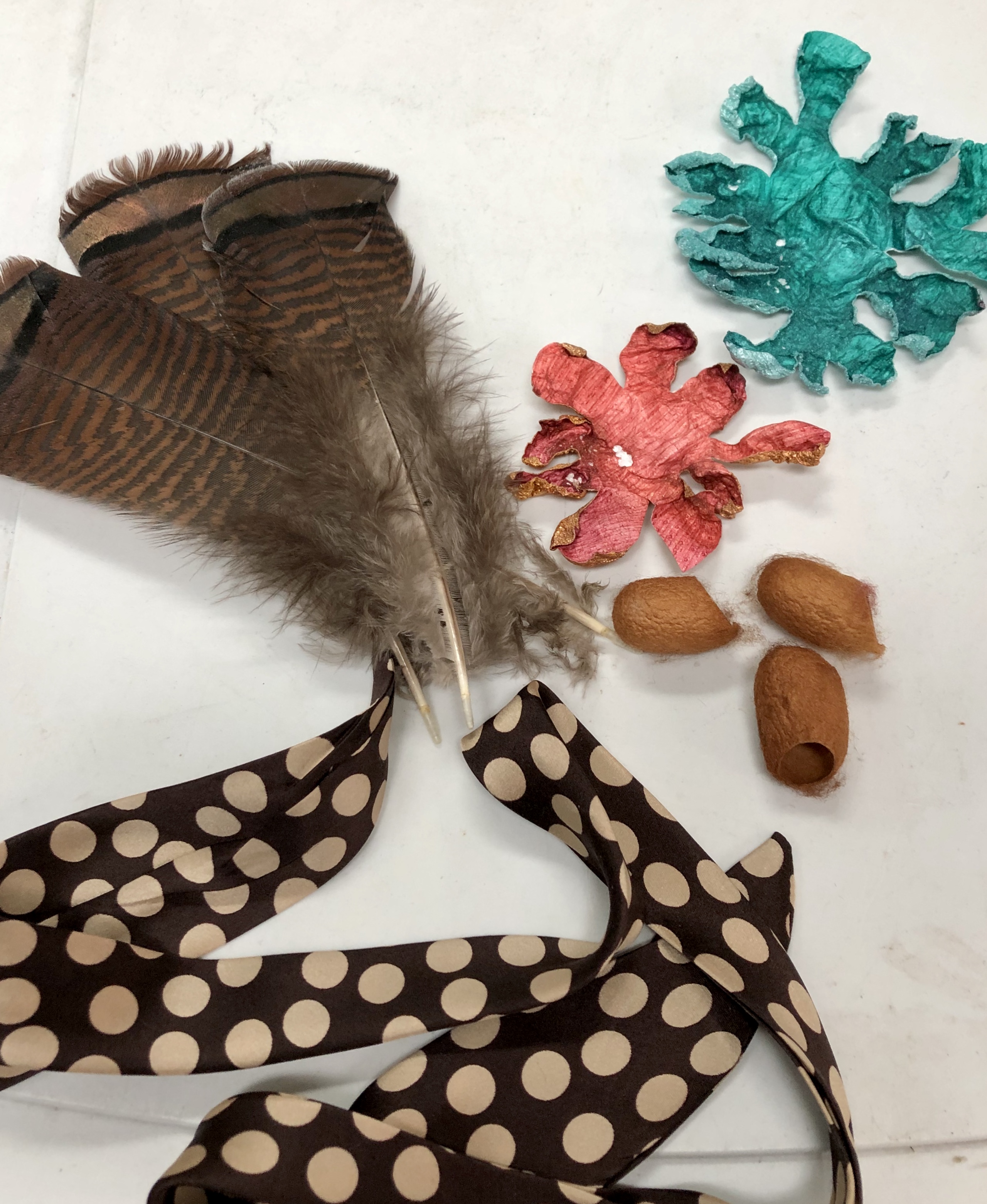 Embellished with found turkey feathers, tyvek flowers, natural dyed silk cocoons and a silk band I made from a scrap leftover from my dress.