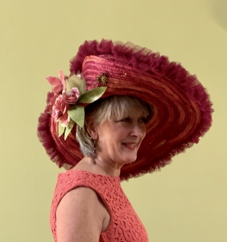 I wanted my challenge entry to be more than just a hat (noting Jody’s advice) and with this being the final week, I decided to take one more opportunity to restyle a garment for my wardrobe. I upsized a beautiful coral lace dress incorporating a flippy hemline from a coral knit dress. I also thought the elements of my ensemble should mean something. This is the symbolism you will find in my Kentucky Derby Outfit:
