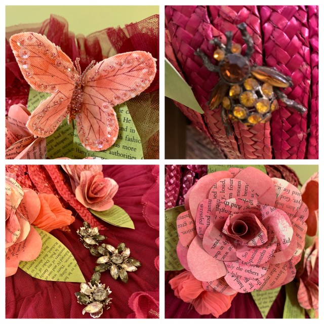 As you look over my hat, you will find beautiful, hand crafted, color-washed book page roses and leaves nestled into the plum tutu skirt that forms the upper brim. Beaded butterflies flit about the roses. From another angle you will find vintage pins from my Mother’s collection. And if you look really closely, you might find a bumblebee pin!
