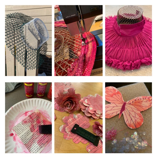 Keeping Jody’s advice in mind, I set out to create my Kentucky Derby Ensemble. I started with a coral, plum and apricot straw tote bag. Other materials included a wire basket, garden fencing, a book (pages and hard cover), a little girl’s tutu, a butterfly print skirt, vintage rhinestone pins, a lace dress and a knit dress.