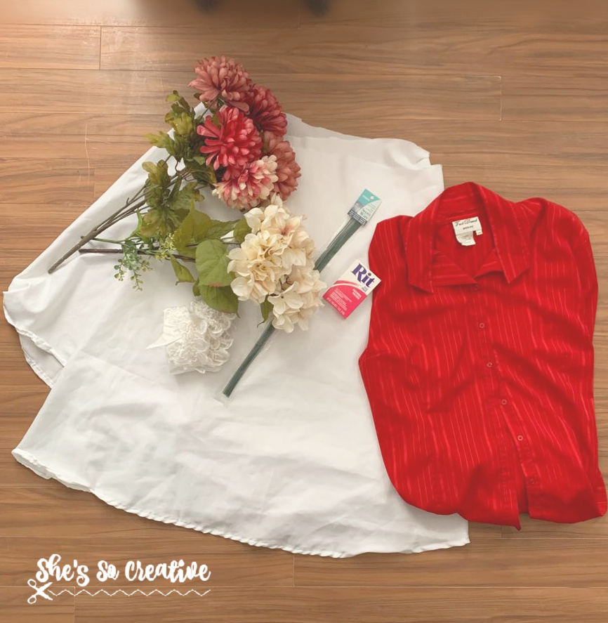 For the Kentucky Derby Hat challenge, I decided to go with a fascinator instead of a hat. I didn’t have anything made from sinamay laying around here (nor could I find it at thrift stores), but I did have a lot of leftover pieces from the wedding dress I used for the Round 3 Faux Fur project! The liner was perfect for the base because it was lightweight and semi-sheer. I also had a red button up that I had bought (but never used) for Round 1, so I used that to make roses to represent the rose garland given to the winner!