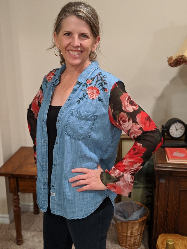 The denim shirt was one my daughter put in the donate pile. The dress was mine from a few years back. I have lost 60 pounds and the dress did not fit. Was so excited to see how well the flowers from the dress went with the flowers on the shirt.