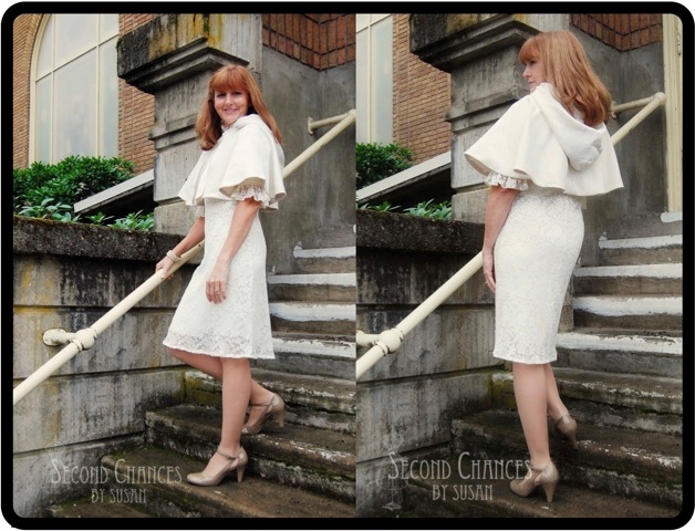 I wanted to say a little bit about the process I use to create my garments, It’s a different approach to upcycling. I like to start with a basic garment. And I usually search through my closet first. The garment I pick becomes my canvas. The pieces of fabric, that I’ve saved from previous projects, upcycling, thrift stores and antique stores, become my paints. I then layer piece upon piece to achieve the desired look I want. It’s like I’m painting with fabric! I feel the most unique thing to use, when creating an upcycled garment, are doilies and crocheted tablecloths. A lot of love and work goes into their creation. They are totally a work of art. To see these amazing pieces discarded is heart breaking. As a result, I chose to use both pieces as my focal points. First, I used a beautiful doily to create the sleeves. I cut it in half, created folds and sewed it on. Next, I used an amazing crocheted tablecloth for the bottom half of the dress. I really wanted to highlight the scalloped edge of the tablecloth, so I made sure it showed in the front. I also made a shrug from the bottom half of the dress that I had cut off.