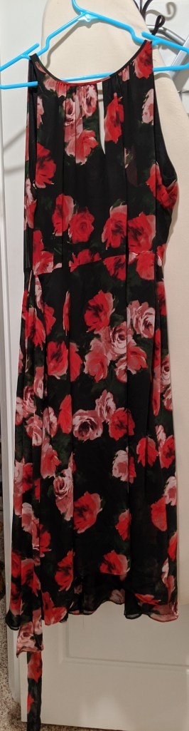 It all began with a dress that I used as a pattern for this one. I traced the shape of the dress but then changed it so that it was a wrap bodice. I cut out a lining from leftover fabric from a previous upcycled project and the top from a thrifted skirt that my mom had given me and used a thrifted Goodwill skirt for the bottom. I cut out the pieces and the battle began. Just kidding! Things went pretty well at first. I sewed darts and the wrap part at the top. Things started to get complicated when I was trying to figure out the wrap around bodice and the zipper and the lining. At one point I held up this big ball of twisted fabric because I had no idea how to untangle it (I took a picture for y’all!). I took a break and when I came back We made peace I was able to untangle it and continued moving forward. I added the zipper, sleeves, and finally finished things up with a zig zag stitch around the bottom of the sleeves and hem of the dress. I always learn from my sewing projects and I learned a lot from this one! I had a lot of fun too, despite The big ball of tangled fabric I had for a while! It turned out well in the end!