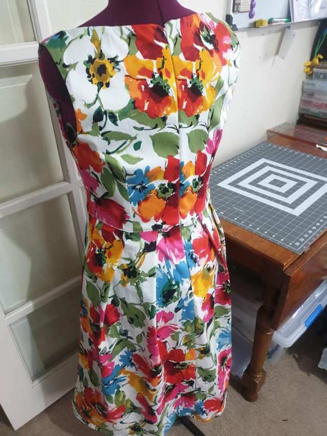 My jacket started life as a dress that a friend gave me. She didn’t like it, but she thought the linen-cotton blend fabric was nice and the print was cool. She gave me a challenge to refashion it. Challenge accepted! Here’s the before look: